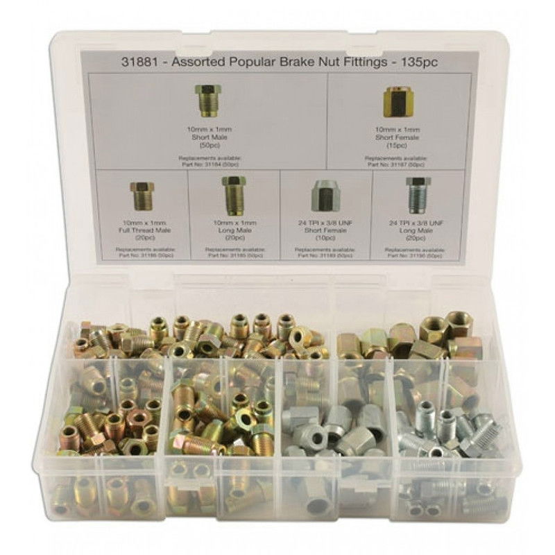 Válogatott és gyári OEM szám alapján gyártott fékcső anya és fékcső csavar (fitting adapter) készlet 135 darabos kiszerelésben.