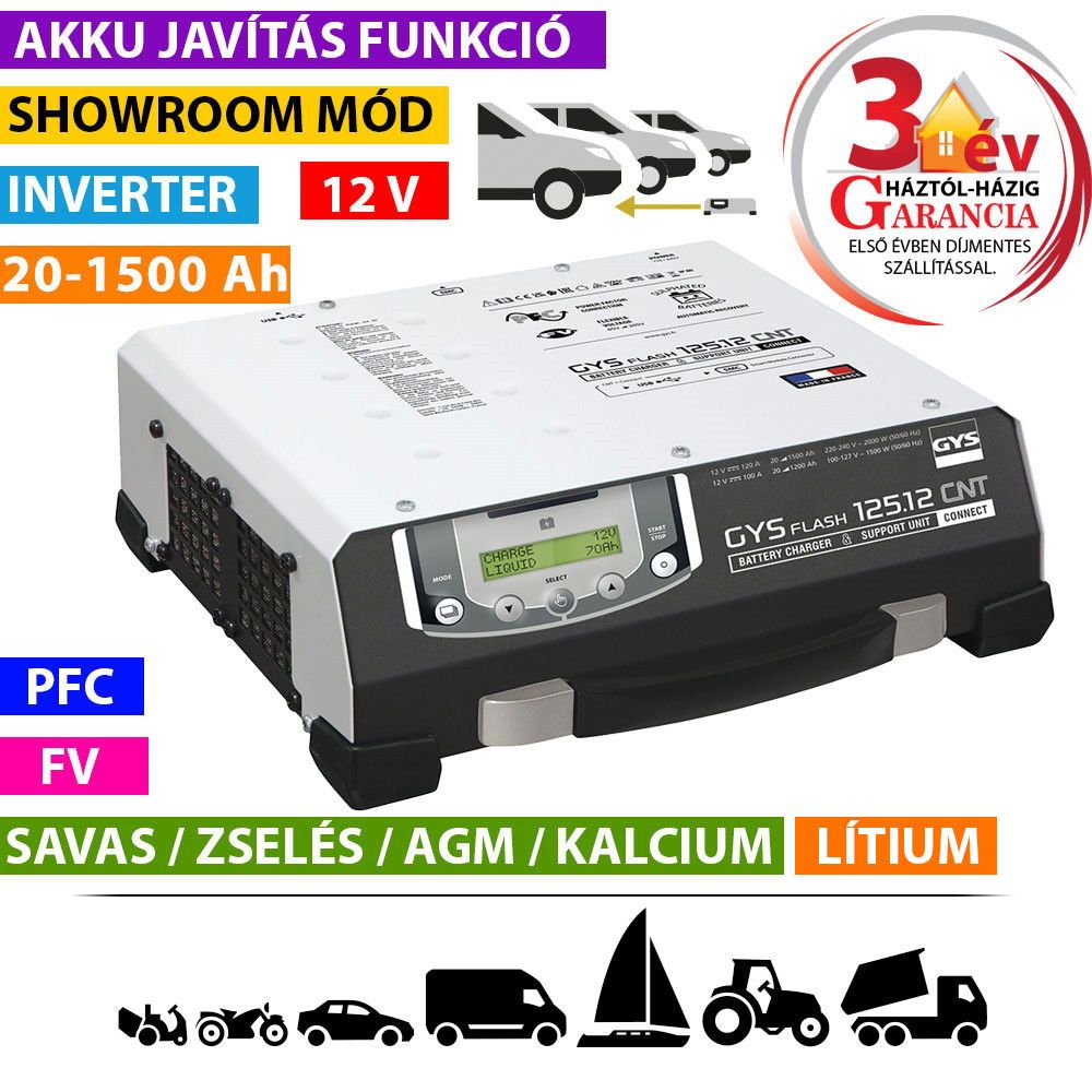 GYSFLASH 125.12 CNT FV inverteres akkumulátor töltő (5 m kábel)